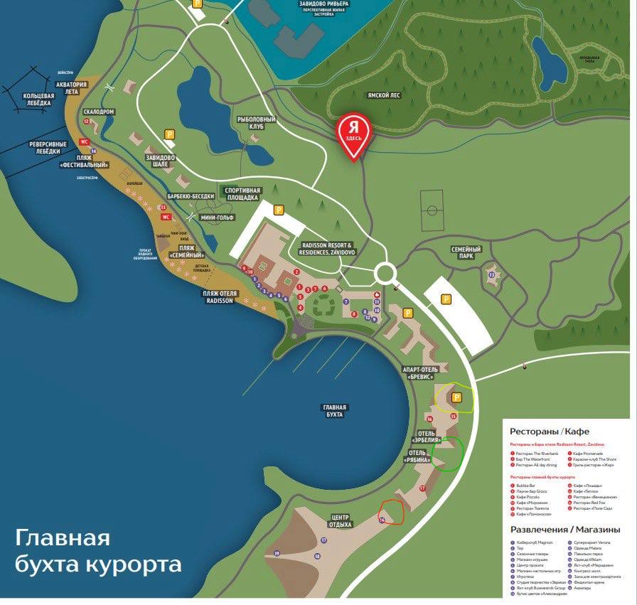 Схема расположения отелей, залов и ключевых объектов на территории курорта.